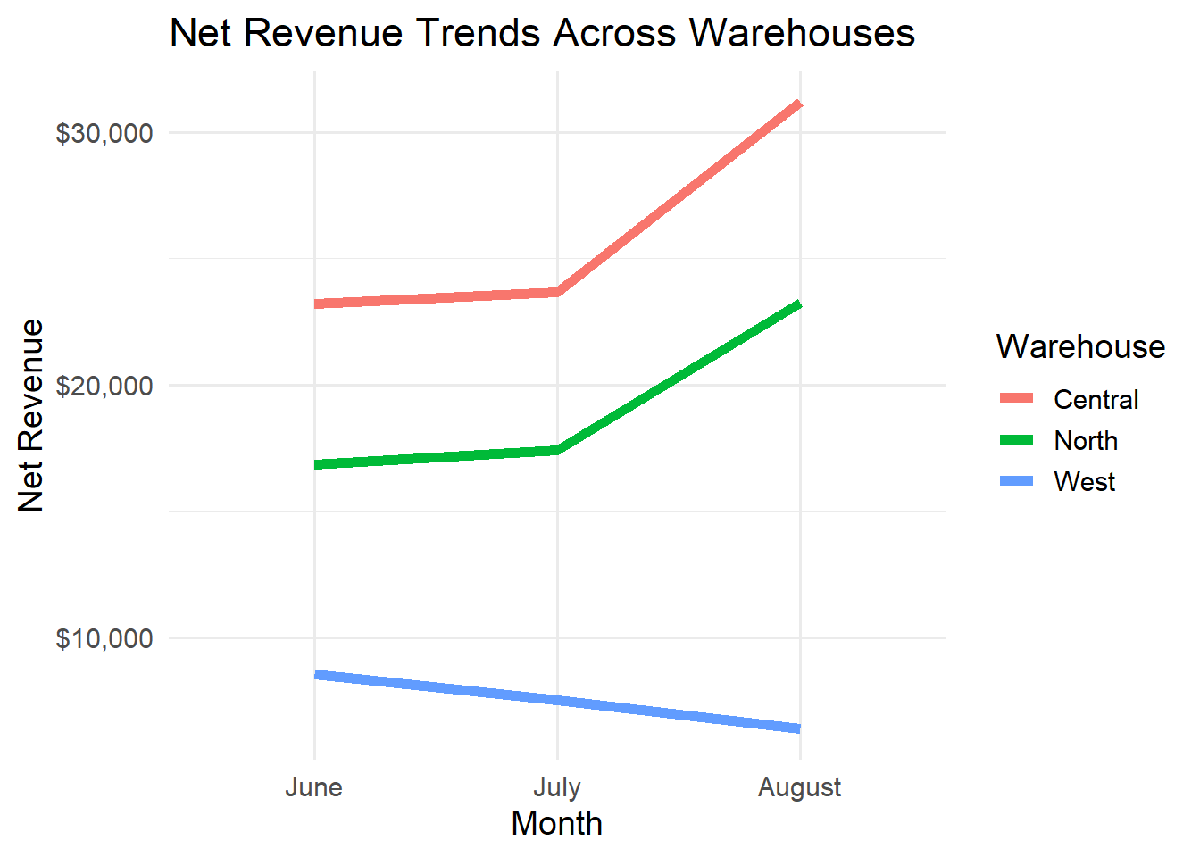 Between July and August, net revenue in Central and North warehouses increased by an average of 33%. - Decline in West Warehouse Performance